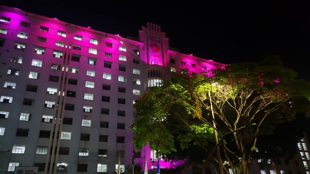 Fachada da Santa Casa BH está iluminada de rosa em defesa da saúde da mulher