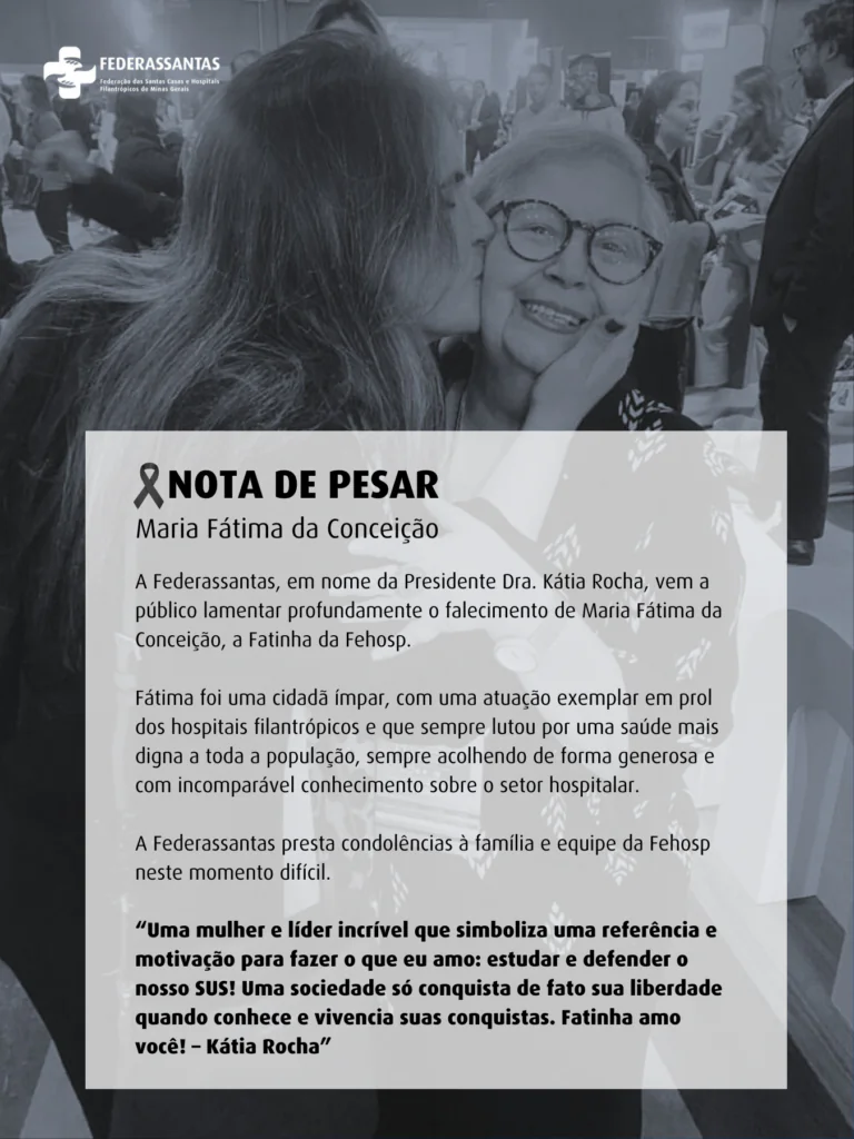 NOTA DE PESAR Maria Fátima da Conceição A Federassantas, em nome da Presidente Dra. Kátia Rocha, vem a público lamentar profundamente o falecimento de Maria Fátima da Conceição, a Fatinha da Fehosp. Fátima foi uma cidadã ímpar, com uma atuação exemplar em prol dos hospitais filantrópicos e que sempre lutou por uma saúde mais digna […]