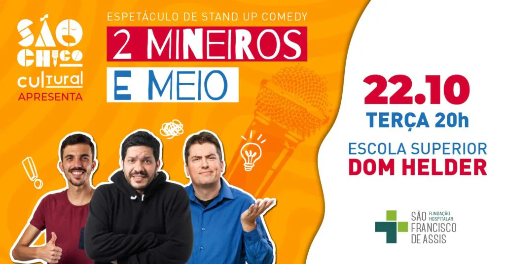 Comédia 2 Mineiros e Meio é a atração do São Chico Cultural Está preparado para morrer de rir? Pois, prepare-se. A próxima atração do São Chico Cultural da Fundação Hospitalar São Francisco de Assis (FHSFA) é a comédia Stand Up 2 Mineiros e Meio, com Stevan Gaipo, Bruno Berg e Paulo Araújo. O espetáculo acontece […]