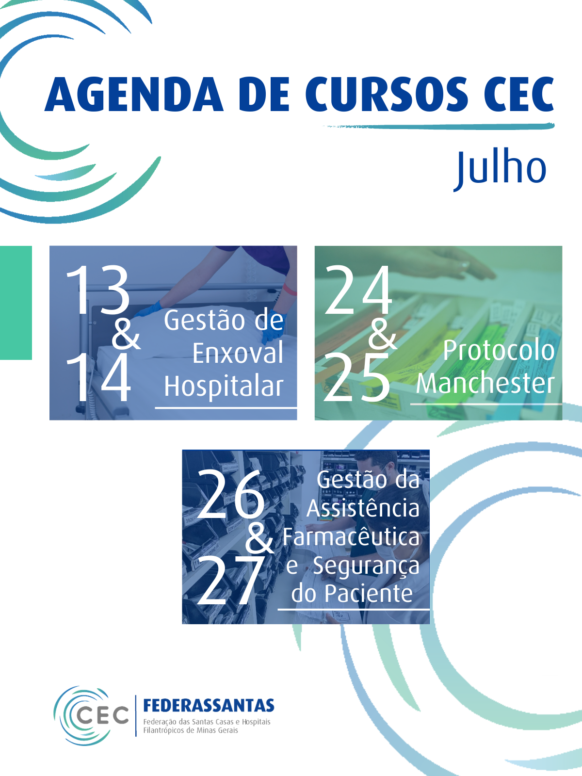O Centro de Educação Continuada (CEC) da Federassantas está com inscrições abertas para cursos online voltados à profissionais da saúde no mês de julho. Serão ofertados os cursos de Gestão de Enxoval Hospitalar, Classificação de Risco com Protocolo Manchester e Gestão de Assistência Farmacêutica e Segurança do Paciente.