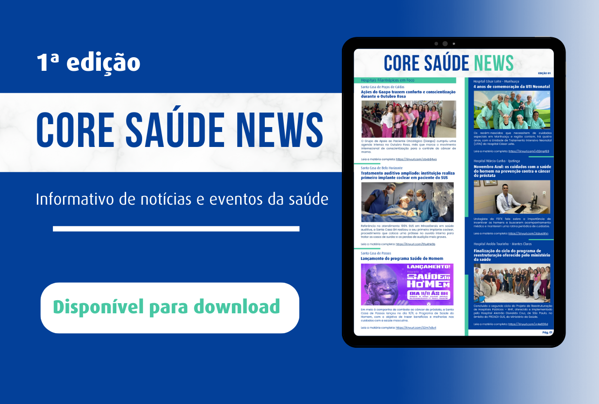 Chegou a primeira edição do CORE SAÚDE NEWS, um informativo com notícias de interesse geral, agenda de eventos e artigos relacionados aos diversos públicos do setor da saúde.