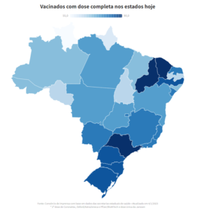 O estado de São Paulo continua com a maior porcentagem de habitantes com vacinação completa: 89,14% de sua população. A seguir, estão Piauí (88,56%), Ceará (86,61%), Paraná (83,53%) e Rio Grande do Sul (82,2%). Em termos percentuais, o Piauí permanece em primeiro lugar com relação à aplicação da primeira dose: 94,69% dos habitantes locais. São Paulo (91,86%), Ceará (88,92%), Pernambuco (87,64%) e Paraná (87,42%) vêm na sequência.