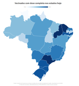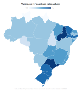 O estado de São Paulo continua com a maior porcentagem de habitantes com vacinação completa: 89,17% de sua população. Piauí (88,58%), Ceará (86,72%), Paraná (83,53%) e Rio Grande do Sul (82,23%) vêm a seguir. Em termos percentuais, o Piauí lidera quanto à aplicação da primeira dose: 94,7% dos habitantes locais. Na sequência, estão São Paulo (91,89%), Ceará (88,96%), Pernambuco (87,64%) e Paraná (87,42%).