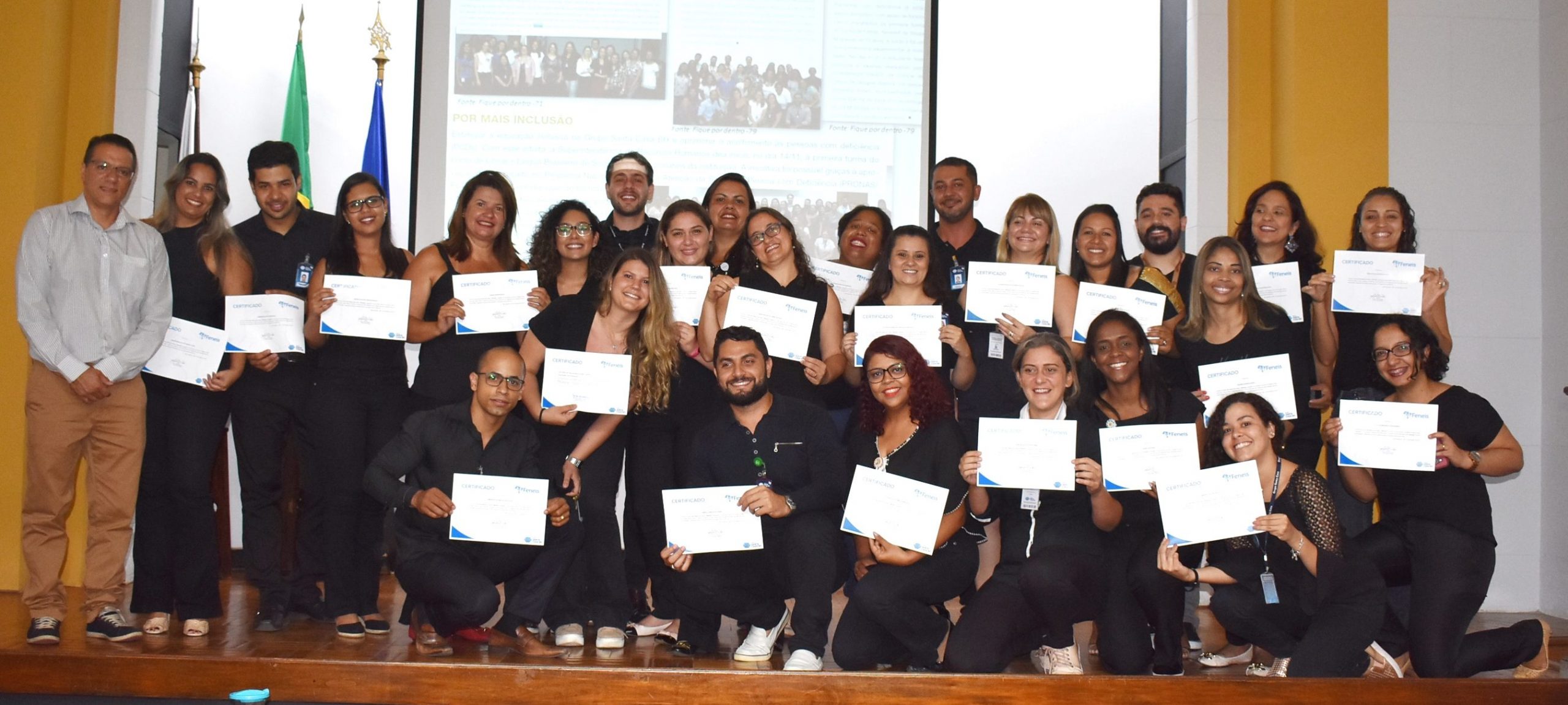 Os alunos da 1ª turma do curso de Libras (Língua Brasileira de Sinais) da Santa Casa BH receberam, no dia 15 de fevereiro, o certificado de conclusão em cerimônia realizada para marcar a vitória no acolhimento às pessoas com deficiência (PCDs). Os 30 formandos – funcionários das áreas assistenciais e de atendimento ao público – estão capacitados para facilitar a comunicação com os surdos e serão identificados pelo símbolo de acessibilidade em libras em seus crachás. A iniciativa faz parte das comemorações de aniversário da instituição, que completa 120 anos em 21 de maio.