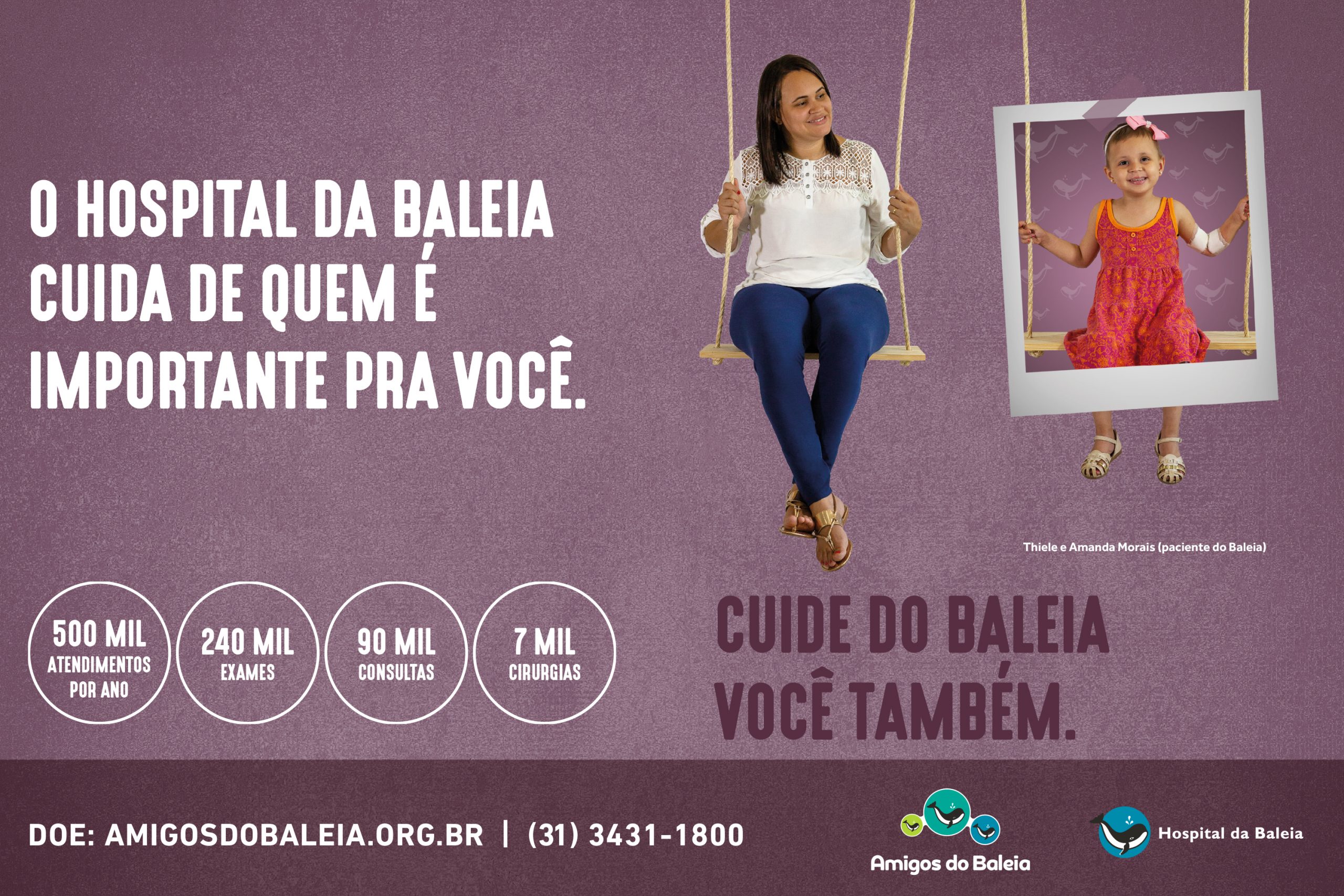 “Quando aquela pessoa especial precisar de cuidados, não se preocupe, o Hospital da Baleia vai cuidar bem dela. Todo ano o Baleia realiza 500 mil atendimentos, 240 mil exames, 90 mil consultas e 7 mil cirurgias. Mas para continuar cuidando, o Hospital da Baleia também precisa ser cuidado. Por todos, por você!”