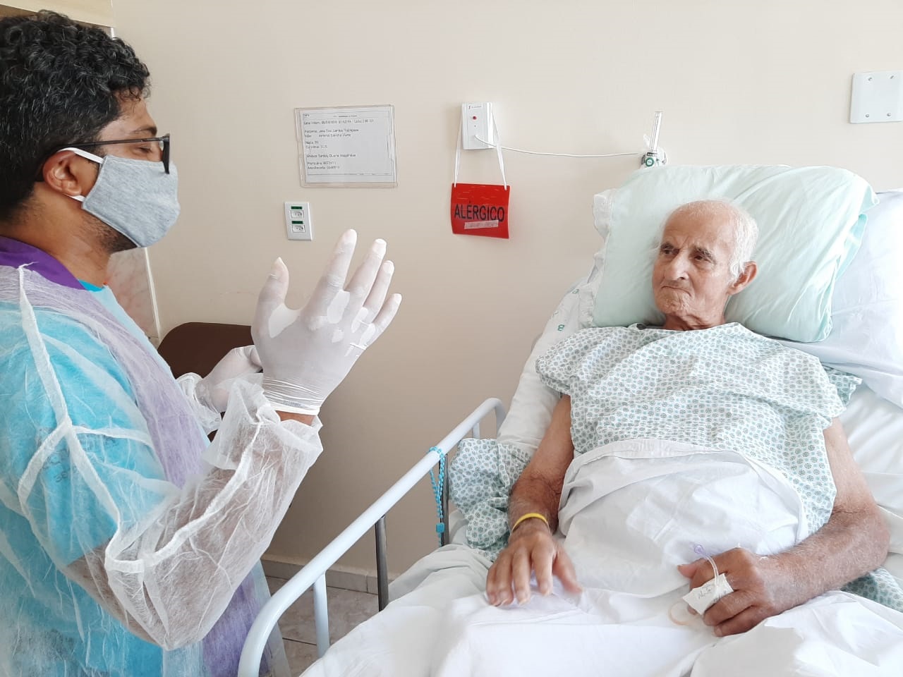 O aposentado José dos Santos Rodrigues, de 91 anos, teve um dia especial neste 15 de setembro. Internado há 38 dias no Hospital Municipal Carlos Chagas (HMCC), em Itabira, ele recebeu a visita de um padre para uma benção. Morador da zona rural e devoto de Nossa Senhora Aparecida, ele é frequentador assíduo de missas. A visita do padre Edson Vander, da paróquia Senhora do Carmo, animou o paciente. “Estou muito feliz, a religião dá uma força muito grande para a gente”, comenta. “Ele estava deprimido esses dias, hoje ele está de cara boa, muito mais corada”, afirma dona Aremita Rodrigues, esposa do aposentado.