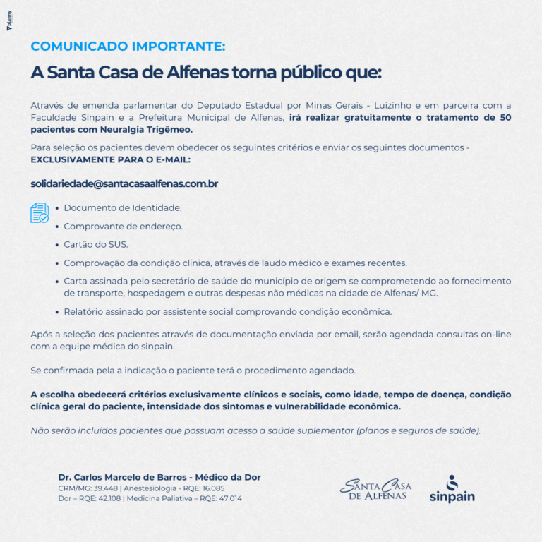 A Santa Casa de Alfenas, no sul do estado de Minas Gerais, vai realizar o tratamento de 50 pacientes com Neuralgia Trigêmeo de forma gratuita. A iniciativa só foi possível através de emenda parlamentar e em parceira com a Faculdade Sinpain e a Prefeitura Municipal de Alfenas.