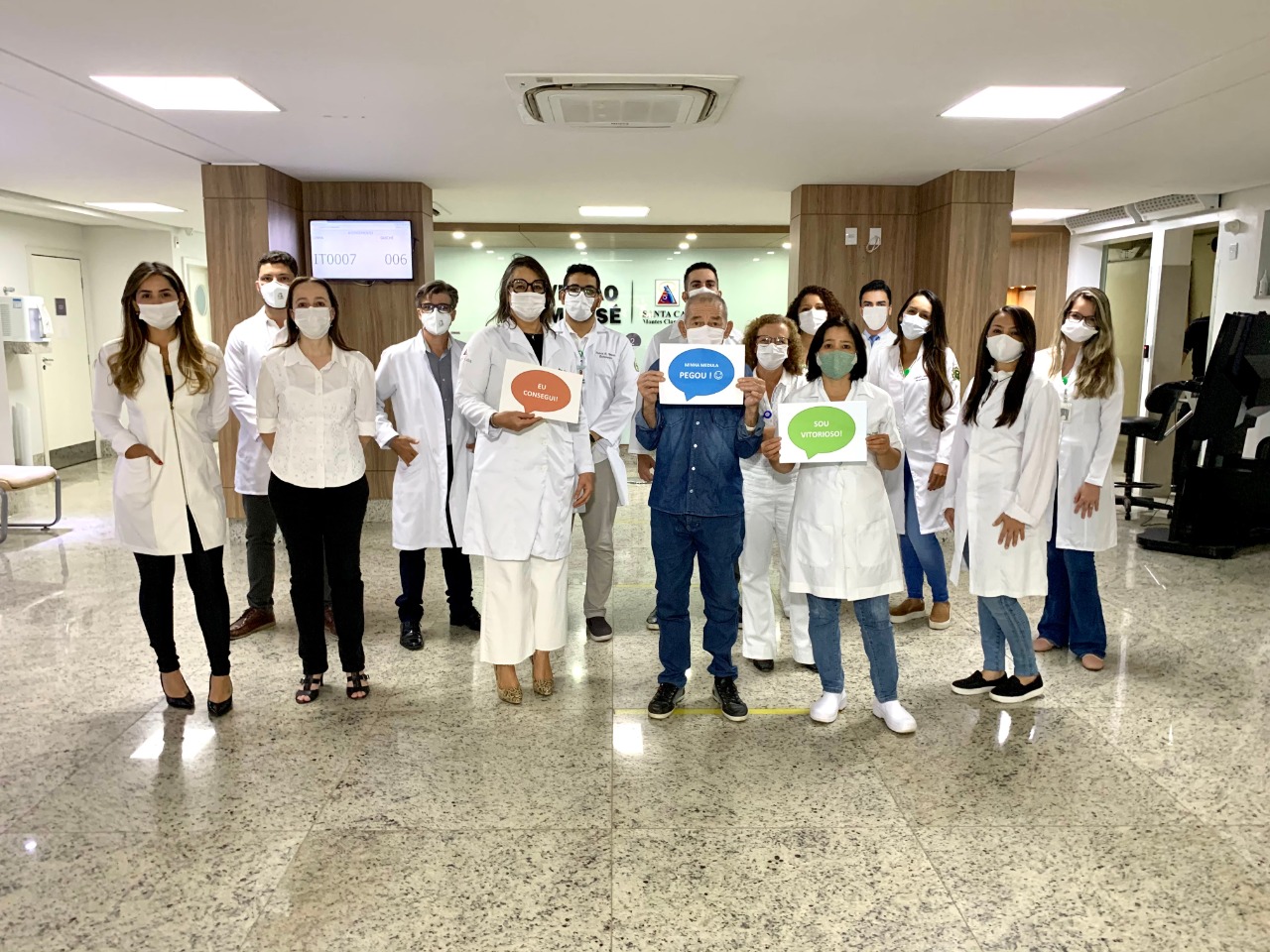 No dia da alta, o paciente José Claret foi surpreendido com a “Festa da Pega” por toda a equipe multidisciplinar da Santa Casa. Emocionados, a equipe explicou para o Seu Claret que o transplante tinha dado certo. “Antes de acontecer esse negócio comigo eu era trabalhador rural. Mas depois, nem uma hora de serviço eu aguentava mais, eu nem levantava da cama. Foi tamanho sofrimento. Graças a Deus, ocorreu tudo bem. Nas mãos de bons profissionais, tudo ficou bem na minha vida. Hoje estou disposto pra voltar pra roça”, conta agradecido. A “pega” da medula é um jargão médico usado carinhosamente quando o corpo volta a fabricar as células do sangue, após o transplante, o que significa que o paciente apresentou recuperação da função da medula óssea nova e o transplante deu certo.