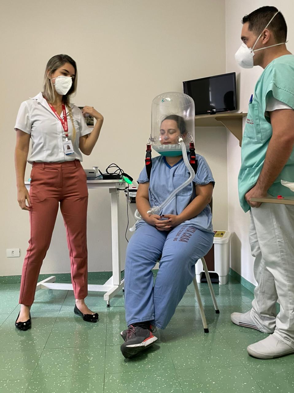 “Nós temos várias interfaces: uma que cobre o nariz e a boca ( orofacial ), outra que cobre o rosto inteiro ( Full Face ) e agora temos mais opção de interface: o Helmit, que cobre a partir do pescoço, cobrindo a cabeça toda. Com ele, os pacientes ficam de uma forma mais confortável, podendo ficar por mais tempo nessa ventilação não invasiva e, consequentemente, alguns pacientes conseguem sair do quadro mais crítico do covid. Com esse equipamento nós já obtivemos resultados positivos evitando a evolução para intubação, consequentemente evitando o uso de sedativos, não sendo então necessário a utilização de mais um leito de UTI. Por isso, o equipamento veio para agregar muito no tratamento”, explica o fisioterapeuta.