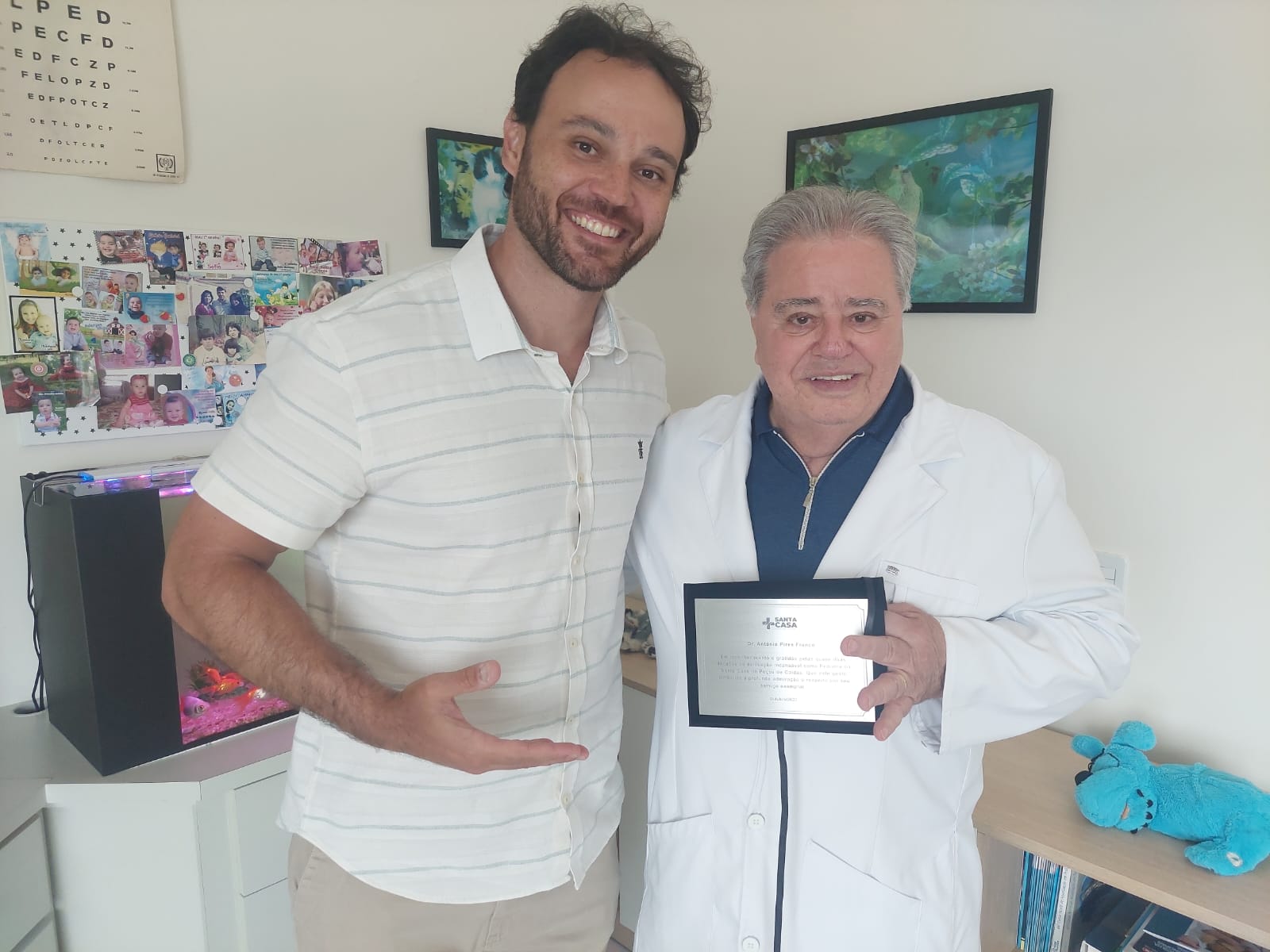 Recentemente, o Dr. Antônio Pires Franco, mais conhecido como Dr. Pires, deixou de fazer parte do corpo clínico da Santa Casa de Poços e, para homenageá-lo pelos quase 20 anos de bons serviços prestados na Pediatria do Hospital, na última sexta-feira, 10, o diretor clínico da Irmandade, Dr. Renan Vicente Braga, esteve em seu consultório para entregar uma placa ao médico pediatra.